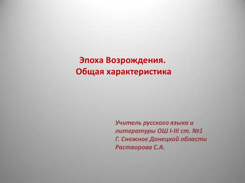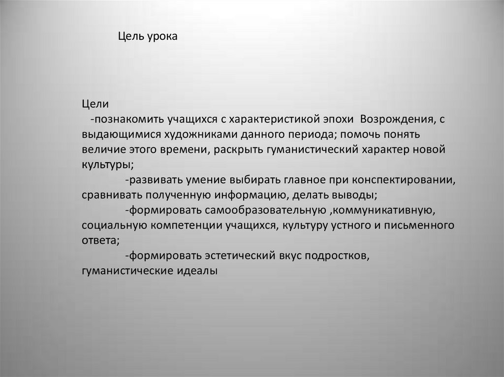 -познакомить учащихся с характеристикой эпохи Возрождения, с