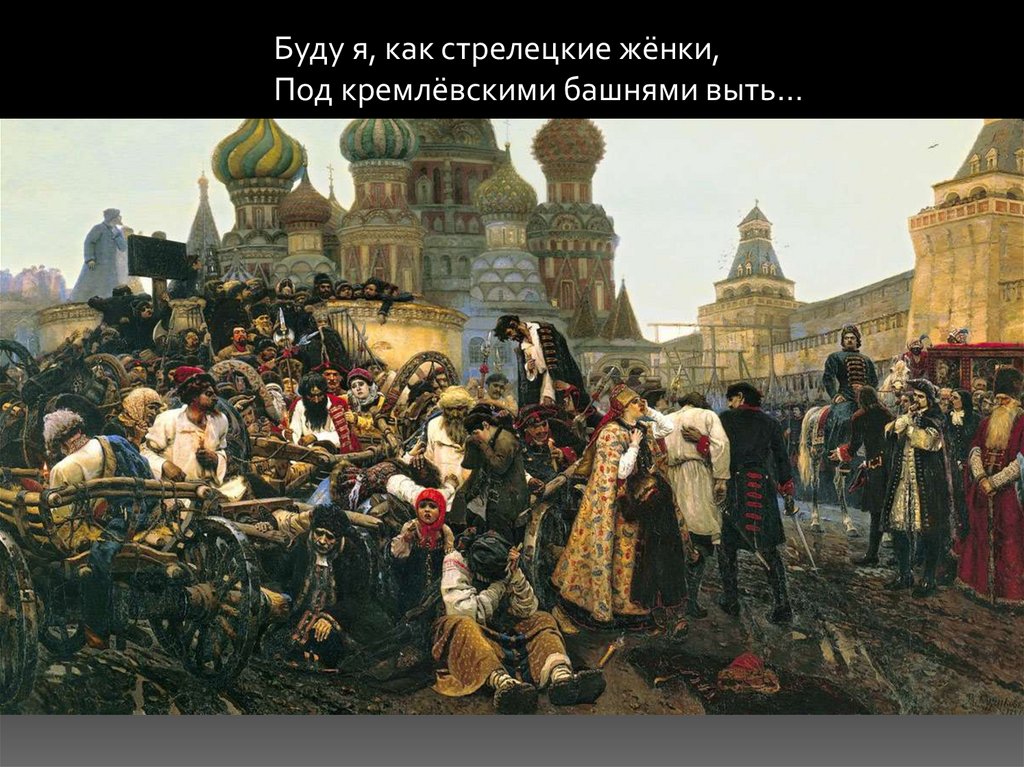 Буду я, как стрелецкие жёнки,Под кремлёвскими башнями выть…