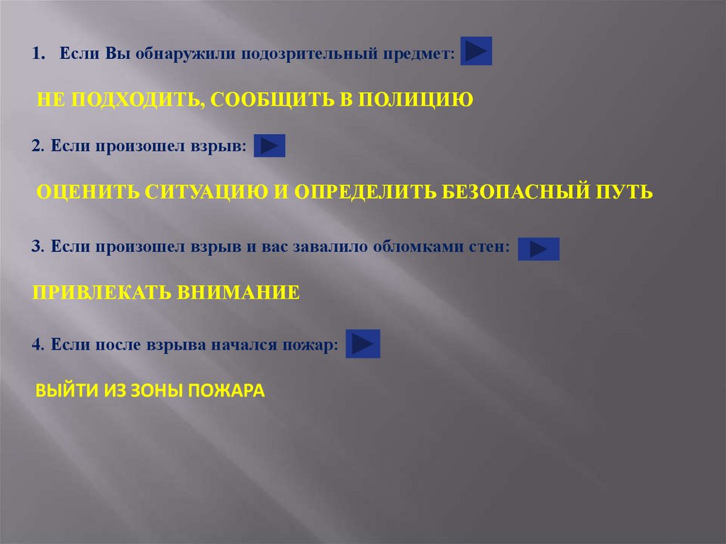 1. Если Вы обнаружили подозрительный предмет:НЕ ПОДХОДИТЬ, СООБЩИТЬ В ПОЛИЦИЮ
