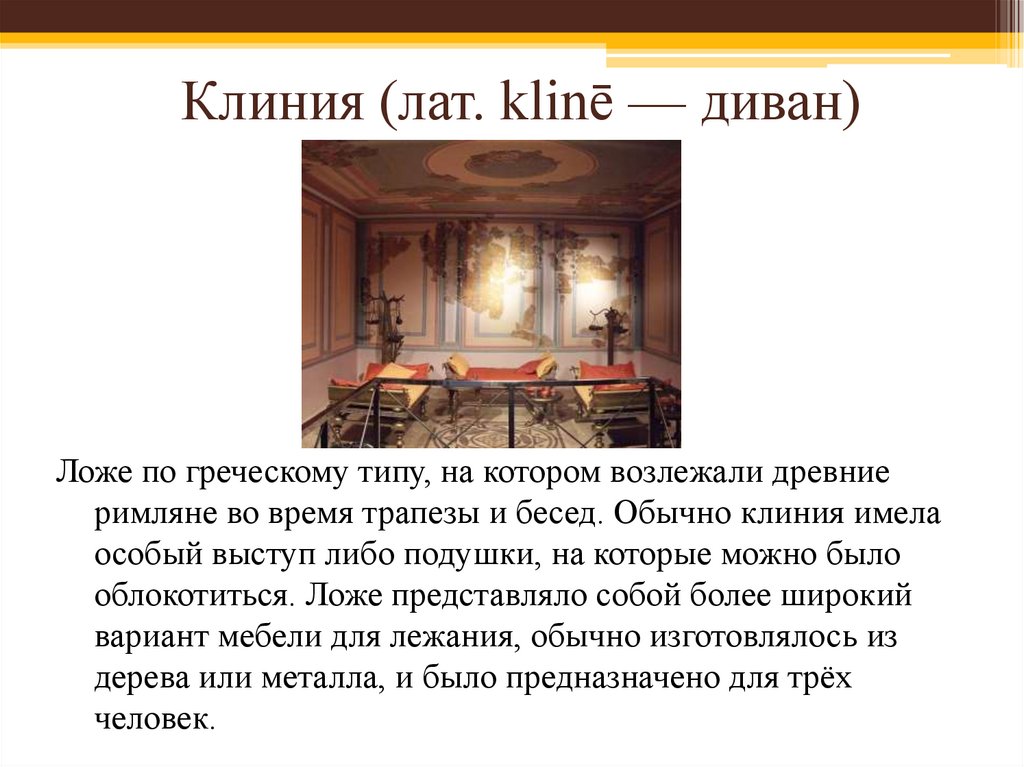 Клиния (лат. klinē — диван)Ложе по греческому типу, на котором возлежали древние