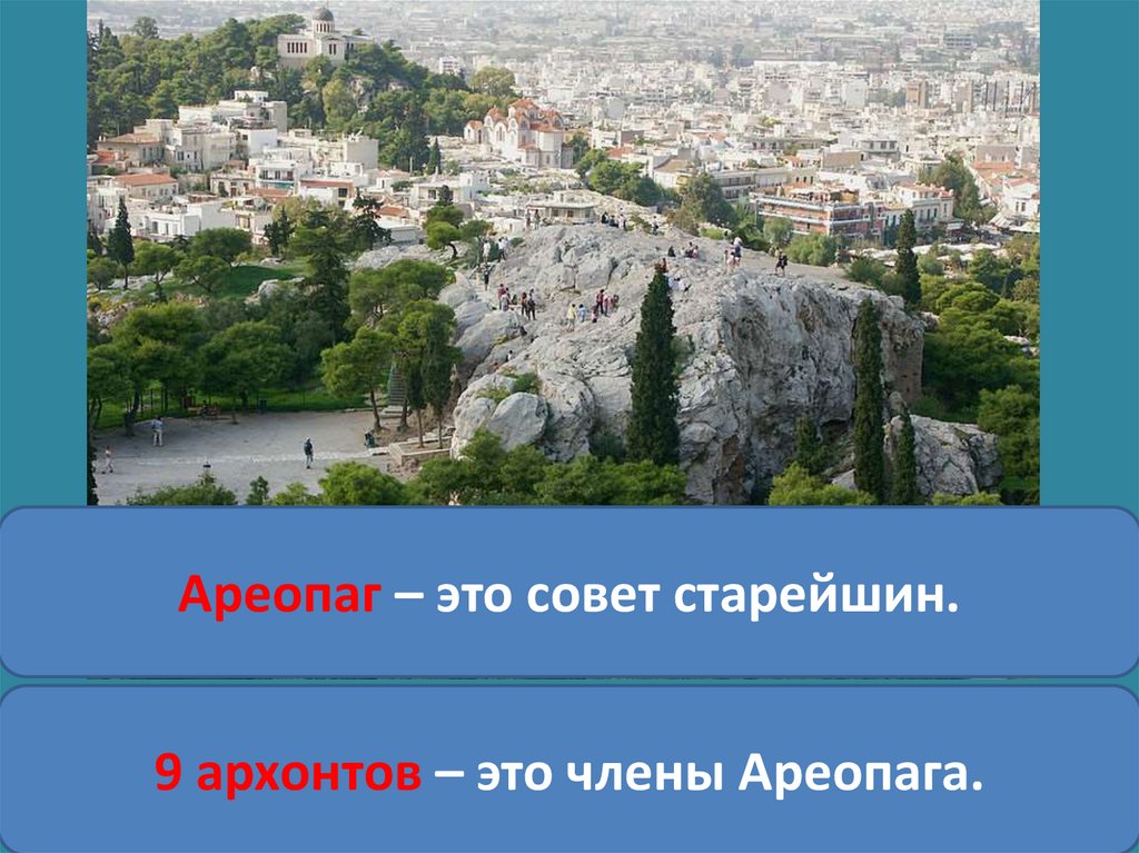 Ареопаг – это совет старейшин.9 архонтов – это члены Ареопага.