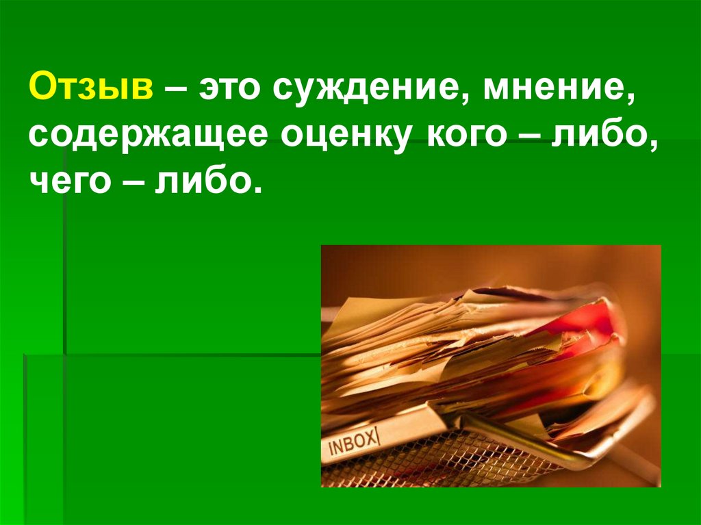Отзыв – это суждение, мнение,содержащее оценку кого – либо,