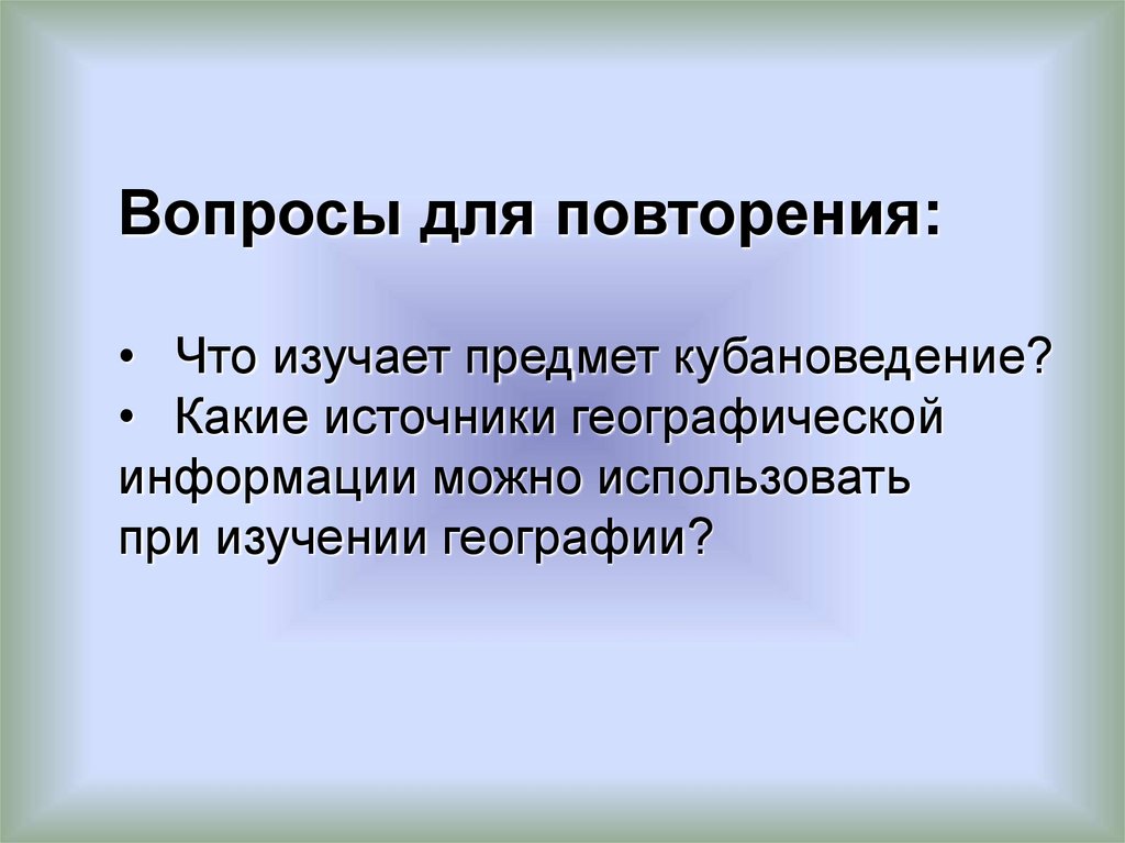 Вопросы для повторения:• Что изучает предмет кубановедение?