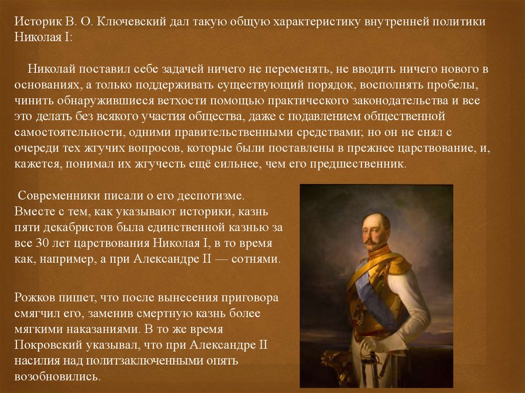 Историк В. О. Ключевский дал такую общую характеристику внутренней политикиНиколая I: