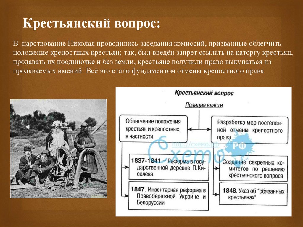 Крестьянский вопрос:В царствование Николая проводились заседания комиссий, призванные облегчить