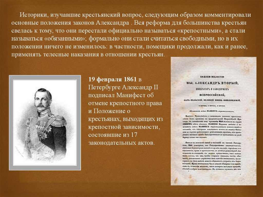 Историки, изучавшие крестьянский вопрос, следующим образом комментировалиосновные положения законов Александра . Вся реформа для большинства крестьян