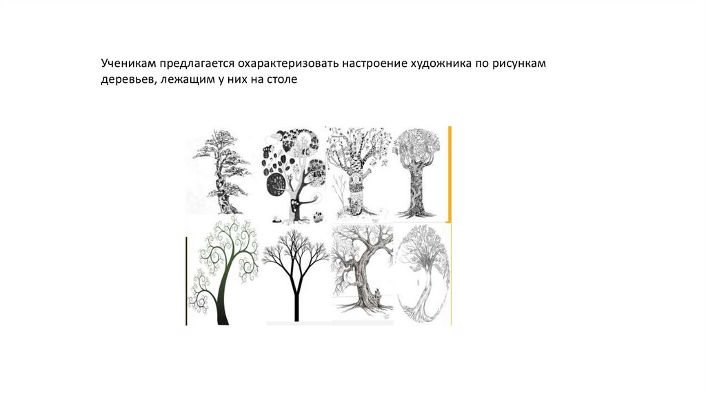 Ученикам предлагается охарактеризовать настроение художника по рисункамдеревьев, лежащим у них на столе