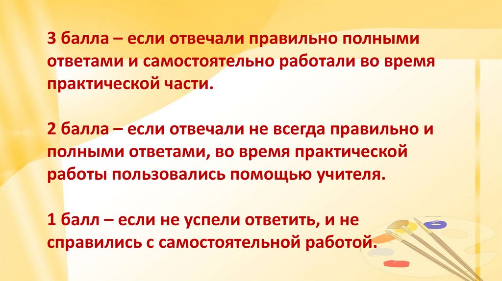 3 балла – если отвечали правильно полнымиответами и самостоятельно работали во время