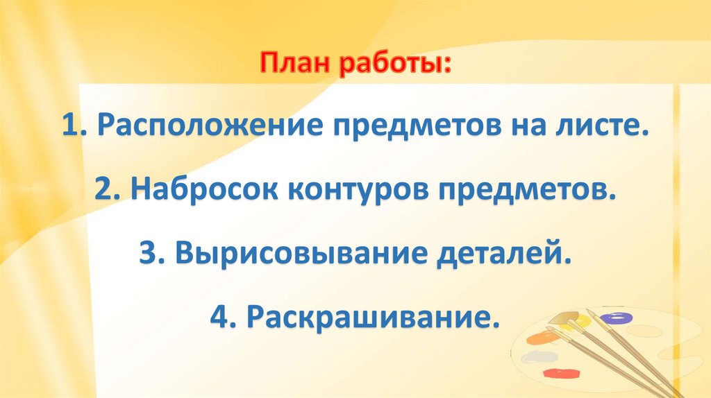 1. Расположение предметов на листе.2. Набросок контуров предметов.
