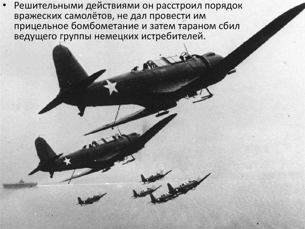 • Решительными действиями он расстроил порядоквражеских самолётов, не дал провести им