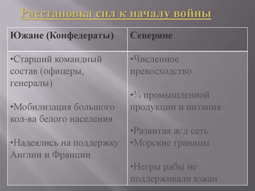 Расстановка сил к началу войныЮжане (Конфедераты)