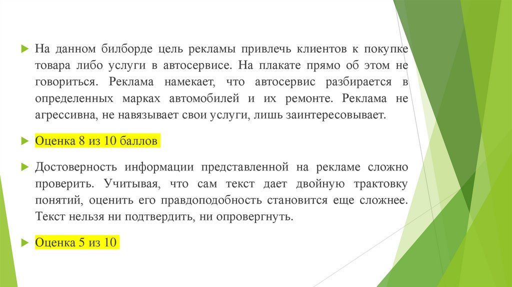 На данном билборде цель рекламы привлечь клиентов к покупкетовара либо услуги в автосервисе. На плакате прямо об этом не