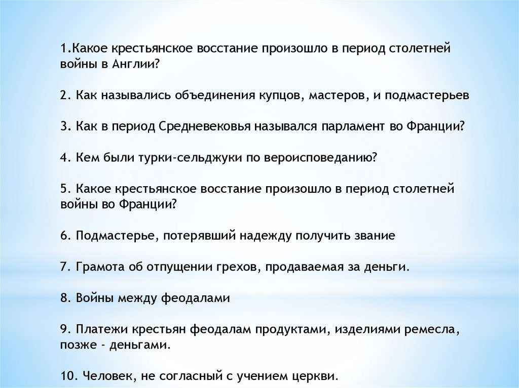 1.Какое крестьянское восстание произошло в период столетнейвойны в Англии?