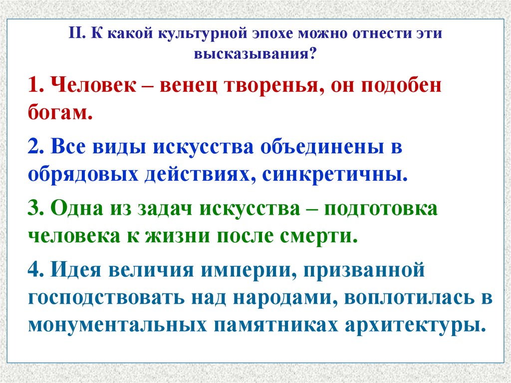 II. К какой культурной эпохе можно отнести этивысказывания?