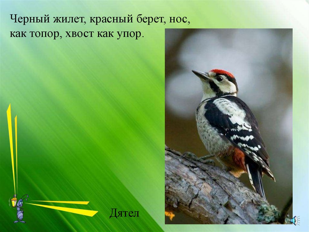 Черный жилет, красный берет, нос,как топор, хвост как упор.