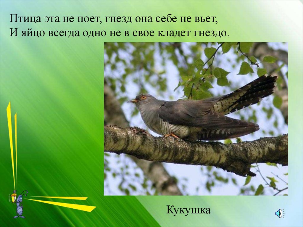 Птица эта не поет, гнезд она себе не вьет,И яйцо всегда одно не в свое кладет гнездо.