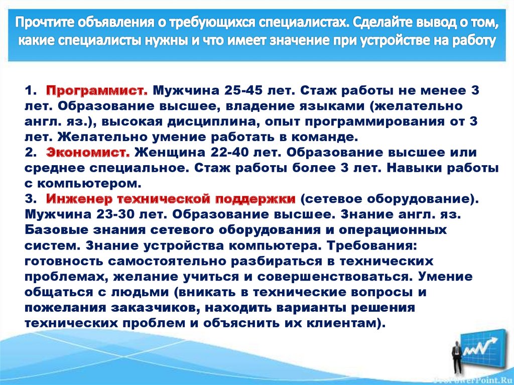 1. Программист. Мужчина 25-45 лет. Стаж работы не менее 3лет. Образование высшее, владение языками (желательно