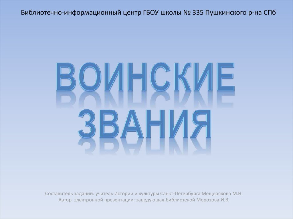 Библиотечно-информационный центр ГБОУ школы № 335 Пушкинского р-на СПбСоставитель заданий: учитель Истории и культуры Санкт-Петербурга Мещерякова М.Н.