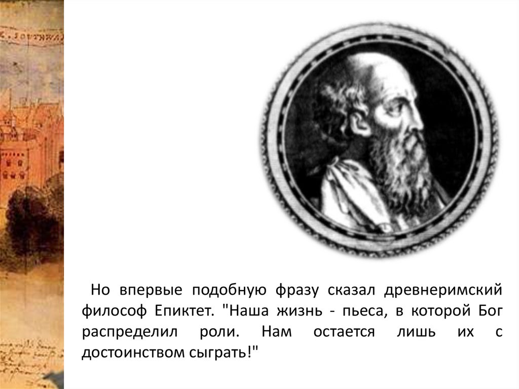 Но впервые подобную фразу сказал древнеримскийфилософ Епиктет. "Наша жизнь - пьеса, в которой Бог