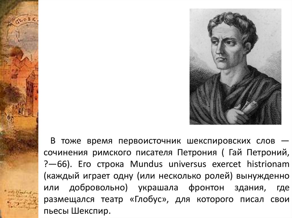 В тоже время первоисточник шекспировских слов —сочинения римского писателя Петрония ( Гай Петроний,