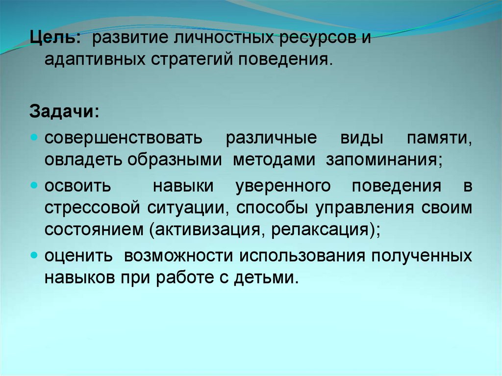 Цель: развитие личностных ресурсов иадаптивных стратегий поведения.
