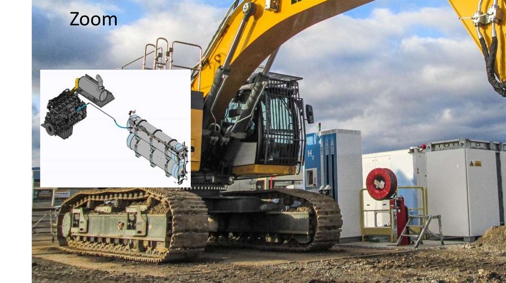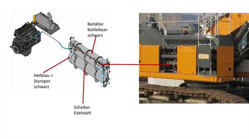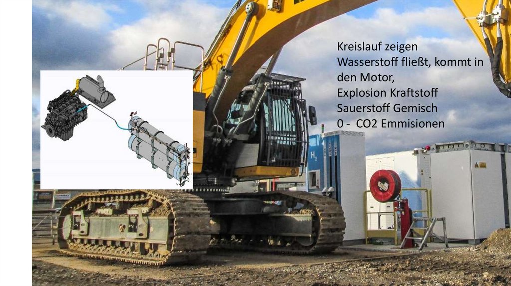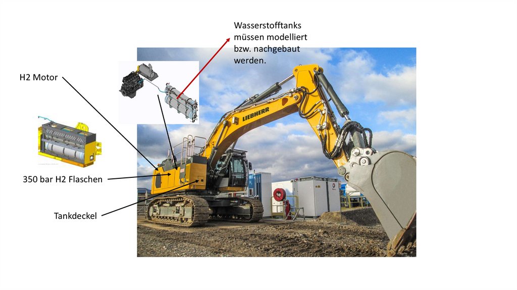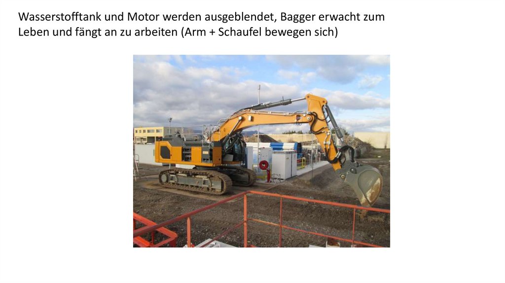 Wasserstofftank und Motor werden ausgeblendet, Bagger erwacht zumLeben und fängt an zu arbeiten (Arm + Schaufel bewegen sich)