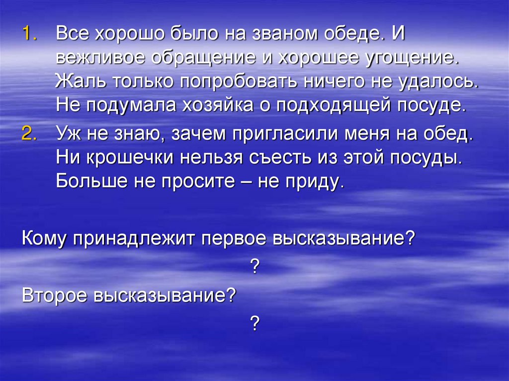 1. Все хорошо было на званом обеде. Ивежливое обращение и хорошее угощение.