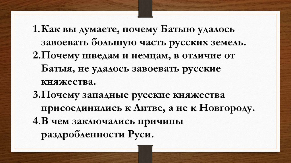 1.Как вы думаете, почему Батыю удалосьзавоевать большую часть русских земель.