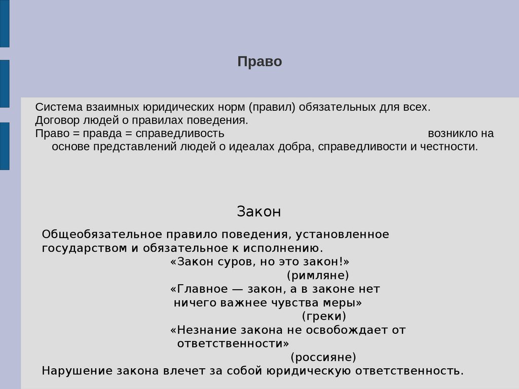 ПравоСистема взаимных юридических норм (правил) обязательных для всех.