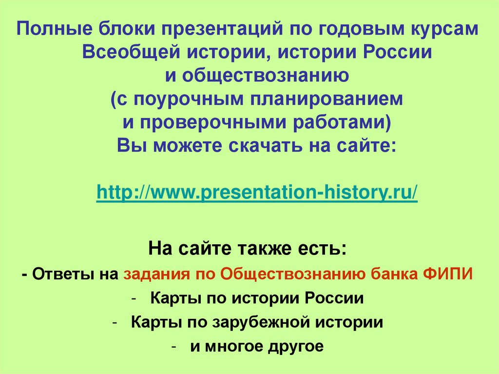 Полные блоки презентаций по годовым курсамВсеобщей истории, истории России