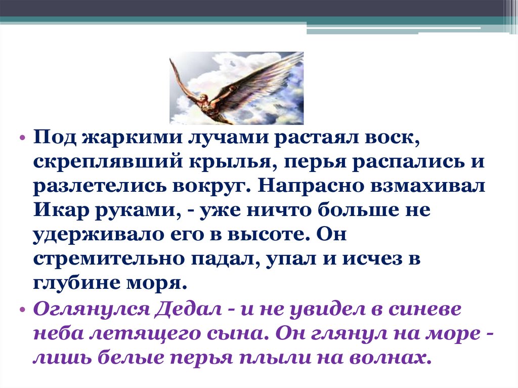 • Под жаркими лучами растаял воск,скреплявший крылья, перья распались и
