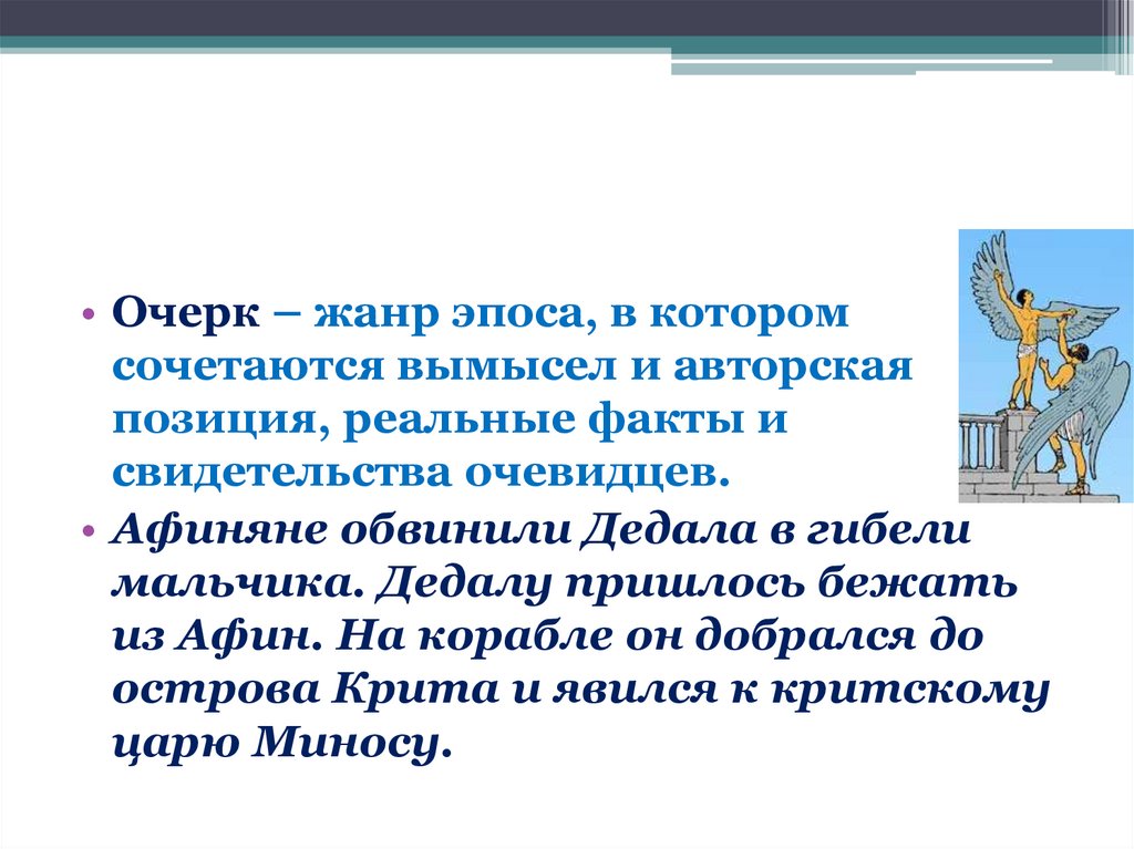 • Очерк – жанр эпоса, в которомсочетаются вымысел и авторская