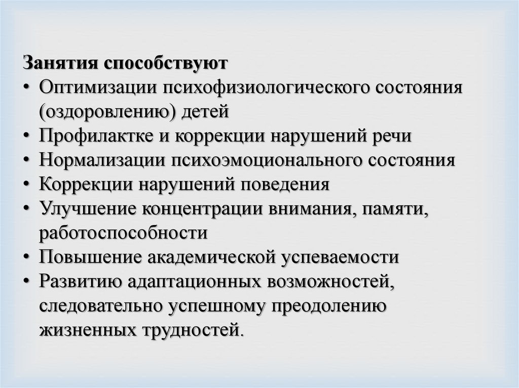 Занятия способствуют• Оптимизации психофизиологического состояния