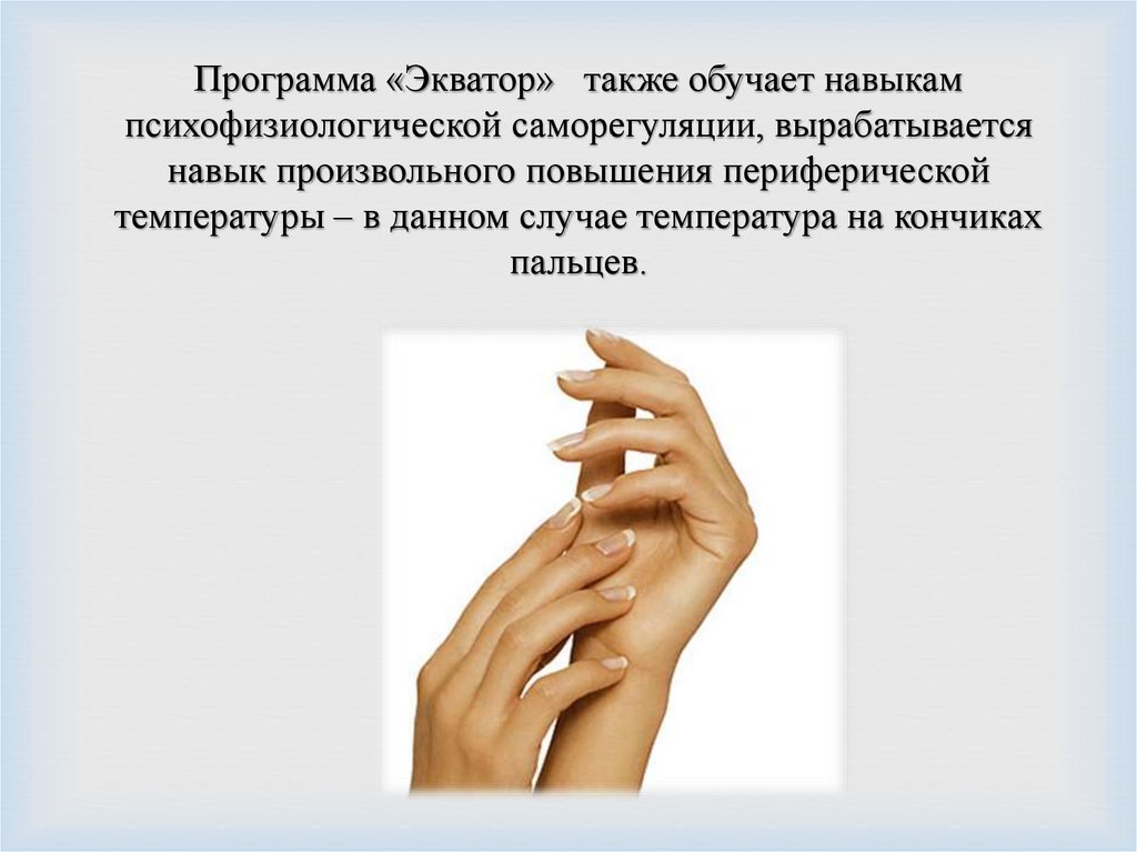 Программа «Экватор» также обучает навыкампсихофизиологической саморегуляции, вырабатывается
