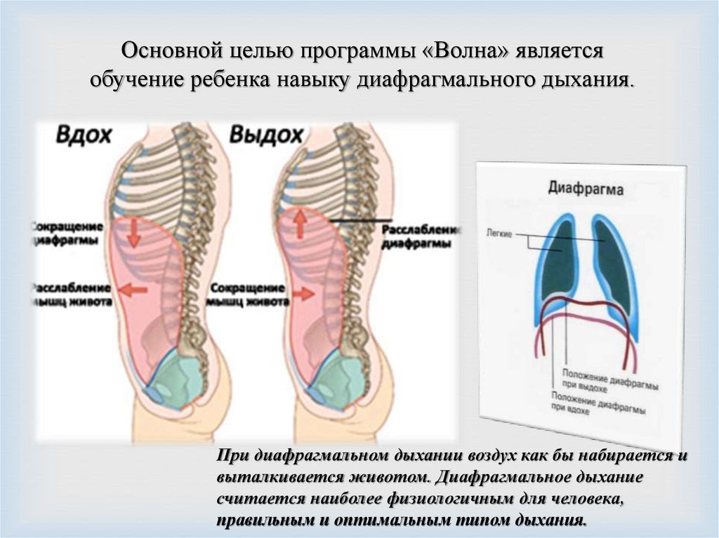 Основной целью программы «Волна» являетсяобучение ребенка навыку диафрагмального дыхания.