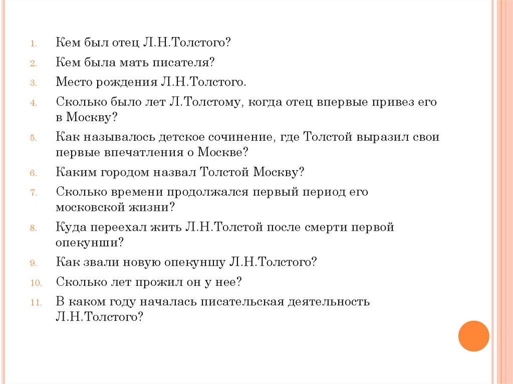 Блиц - опрос по биографии Л.Н. Толстого (5класс)