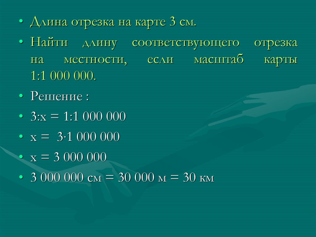 • Длина отрезка на карте 3 см.• Найти длину соответствующего отрезка