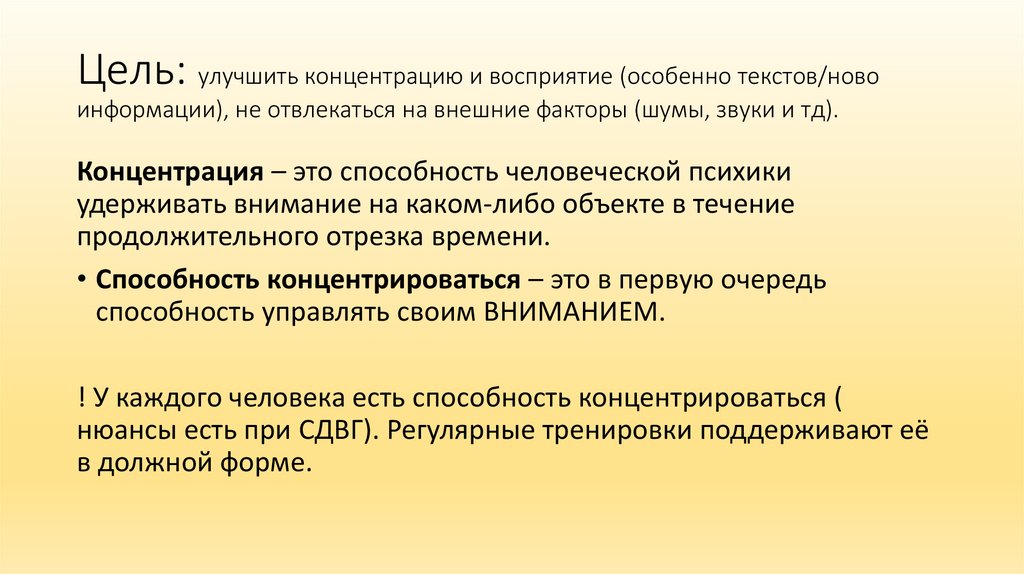 2. Цель: улучшить концентрацию и восприятие (особенно текстов/ново информации), не отвлекаться на внешние факторы (шумы, звуки и