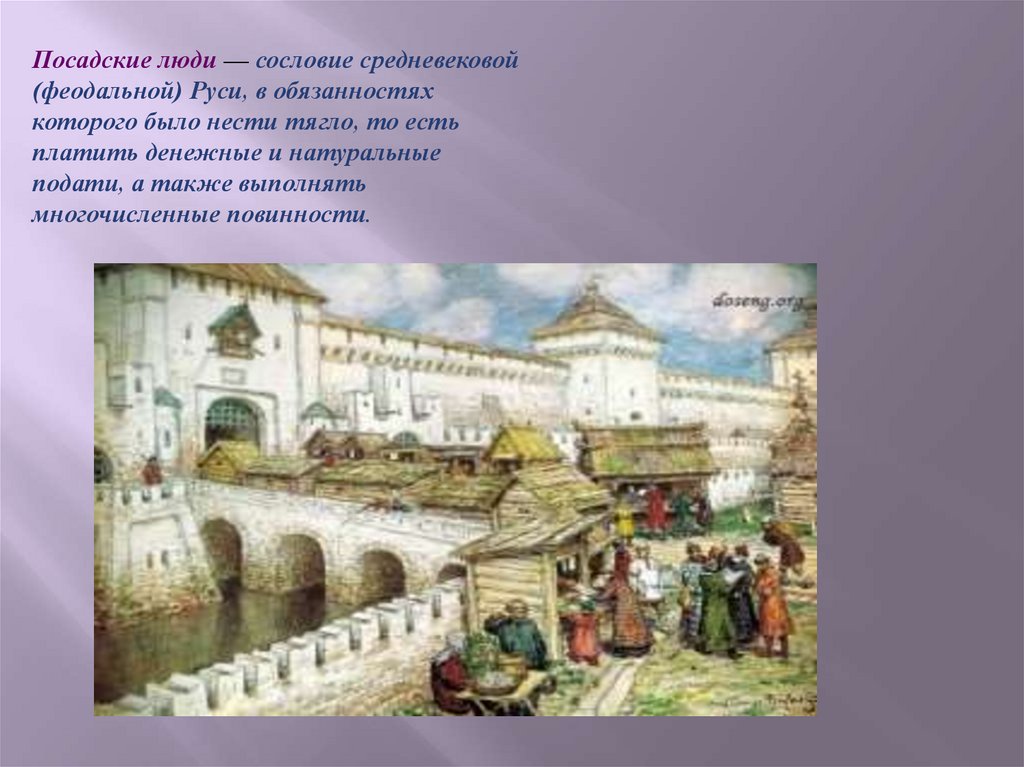 Посадские люди — сословие средневековой(феодальной) Руси, в обязанностях