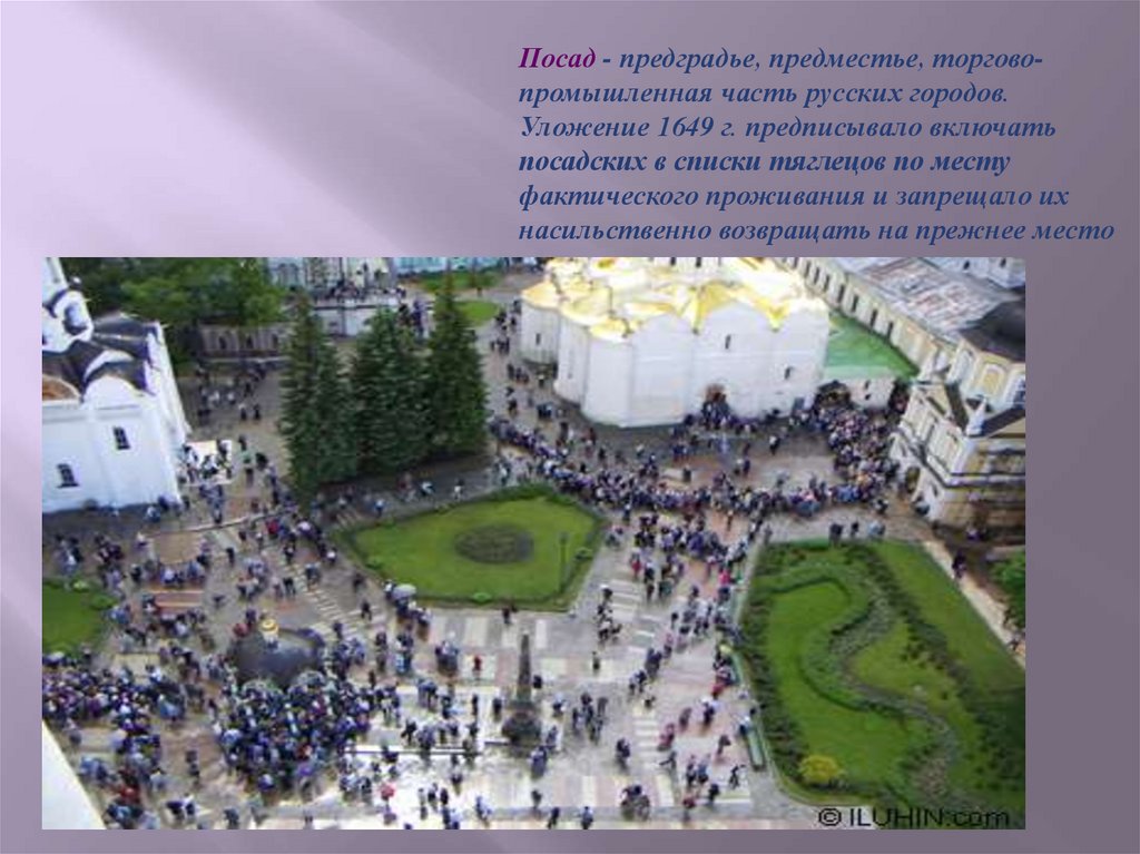 Посад - предградье, предместье, торговопромышленная часть русских городов.Уложение 1649 г. предписывало включать