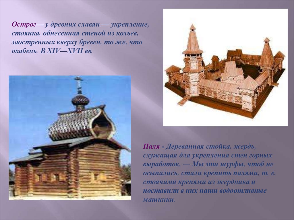 Острог— у древних славян — укрепление,стоянка, обнесенная стеной из кольев,