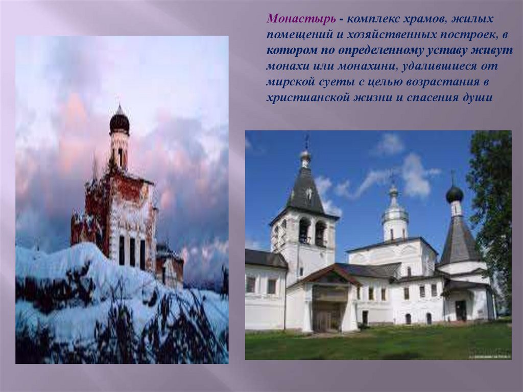 Монастырь - комплекс храмов, жилыхпомещений и хозяйственных построек, в