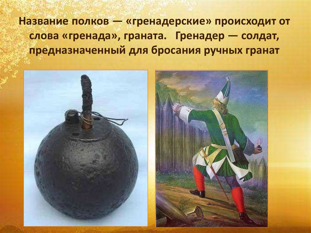 Название полков — «гренадерские» происходит отслова «гренада», граната. Гренадер — солдат,