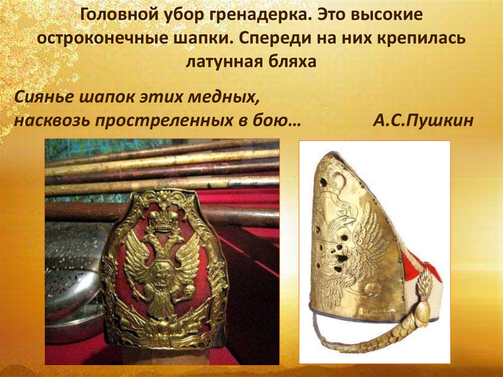 Головной убор гренадерка. Это высокиеостроконечные шапки. Спереди на них крепилась