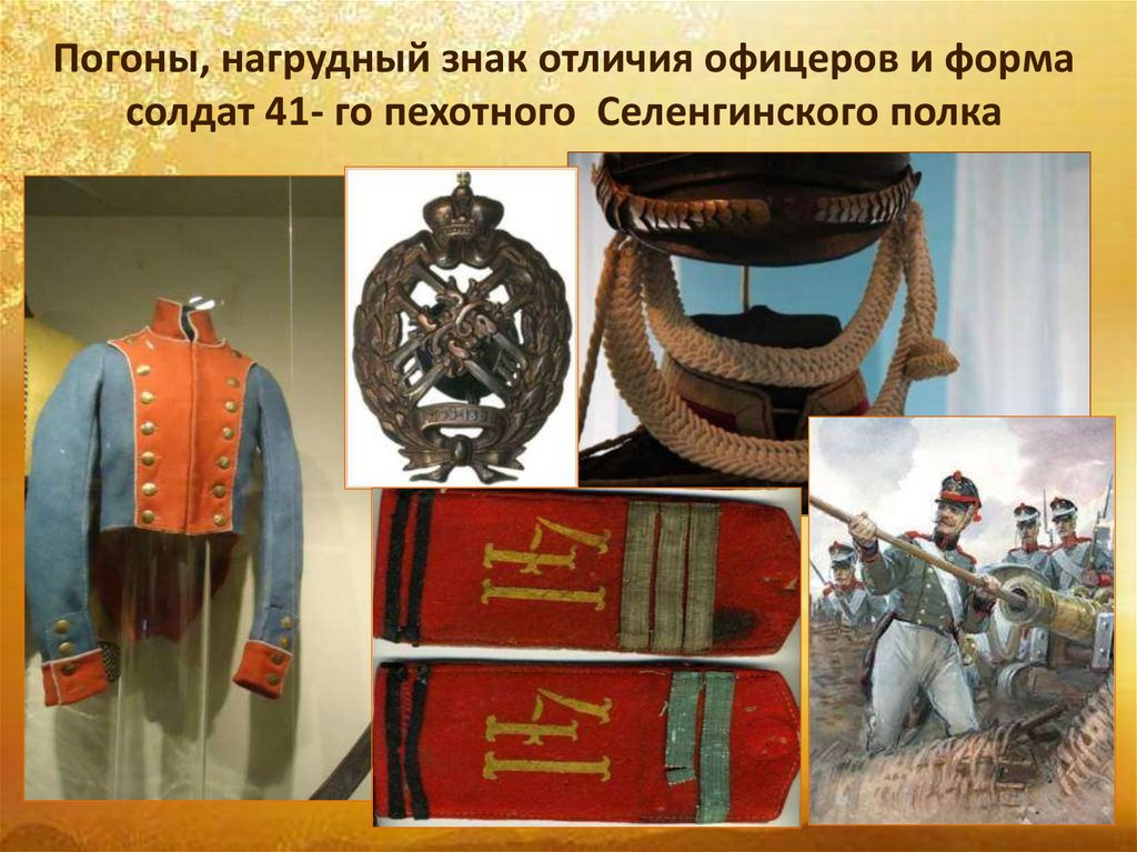 Погоны, нагрудный знак отличия офицеров и формасолдат 41- го пехотного Селенгинского полка