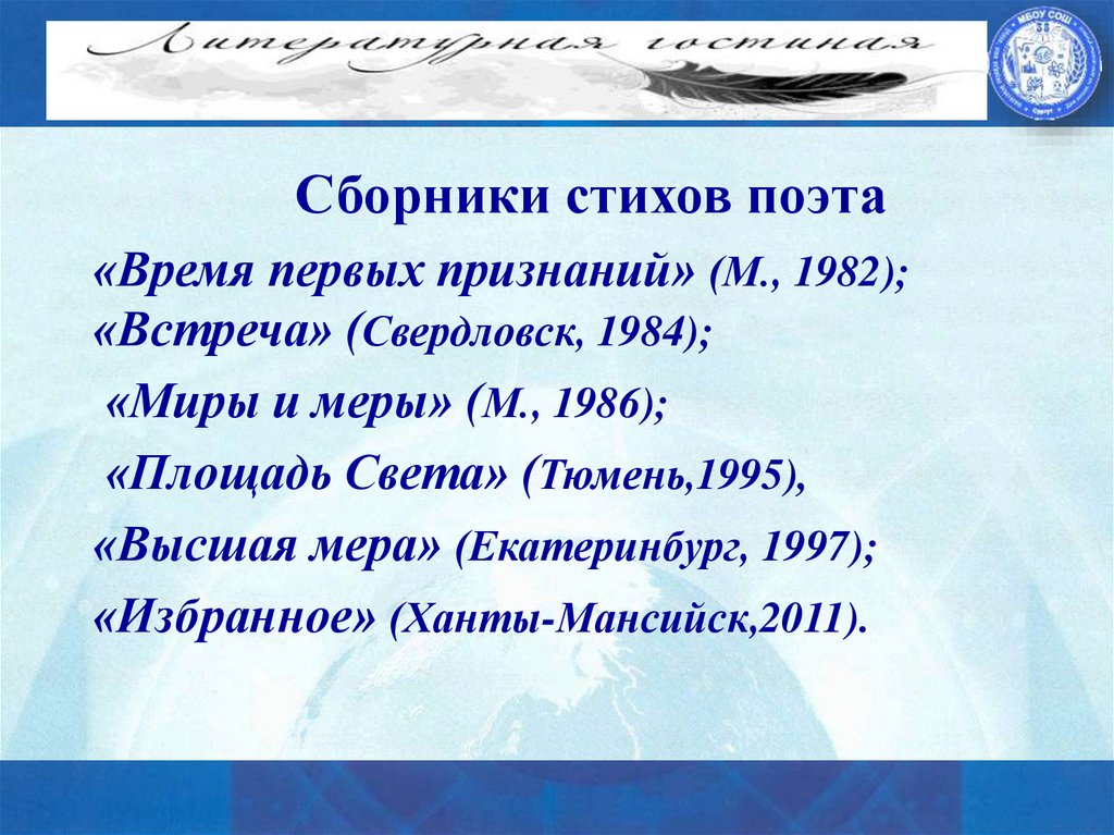 Сборники стихов поэта«Время первых признаний» (М., 1982);