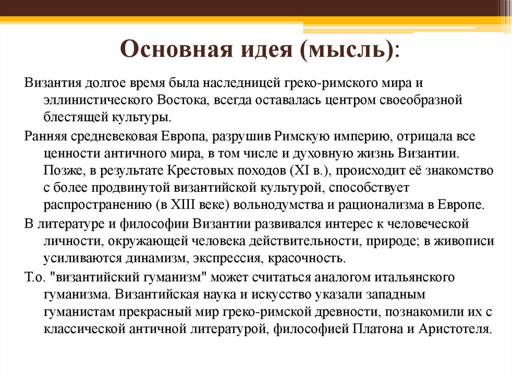 Основная идея (мысль):Византия долгое время была наследницей греко-римского мира и