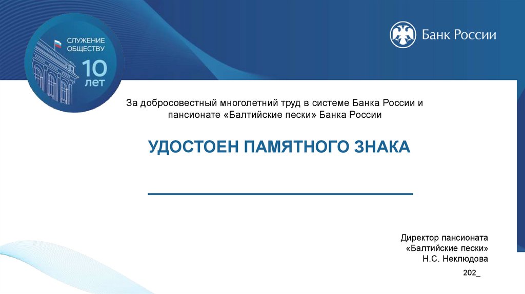 За добросовестный многолетний труд в системе Банка России и пансионате «Балтийские пески»