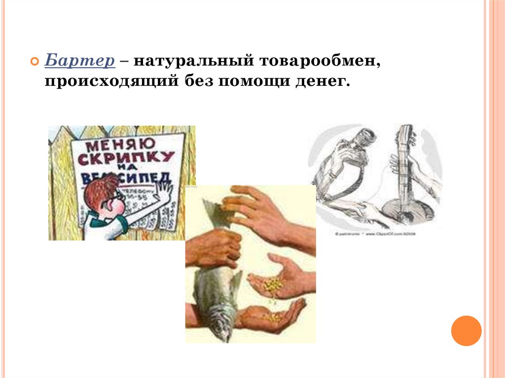 Бартер – натуральный товарообмен,происходящий без помощи денег.