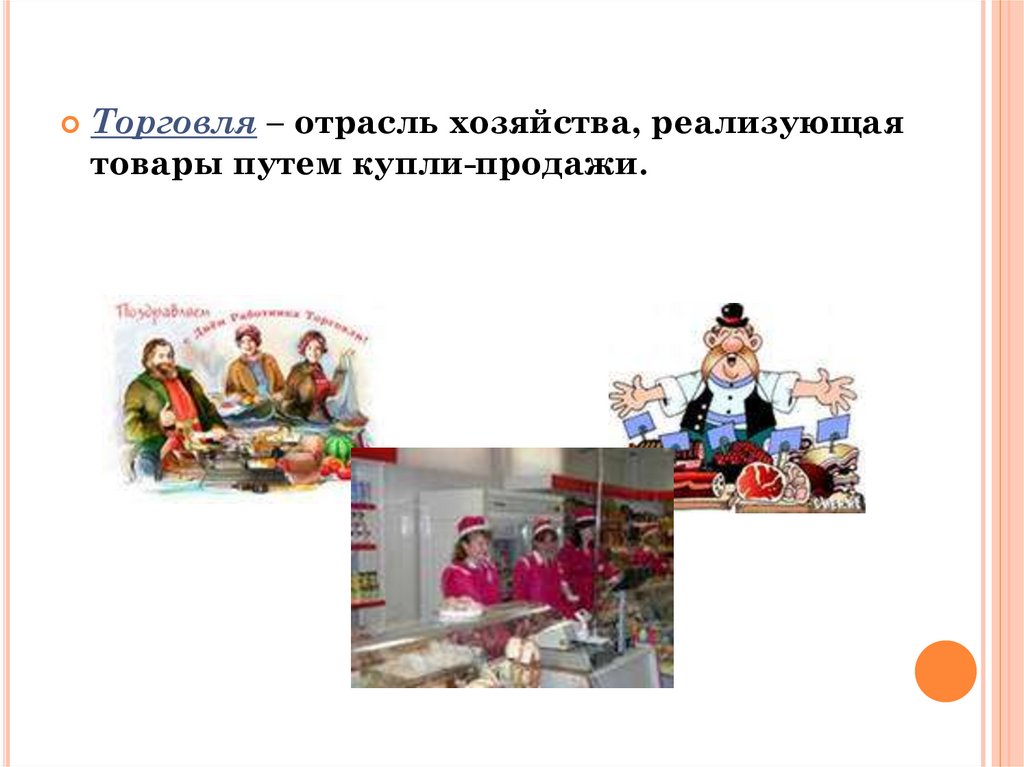 Торговля – отрасль хозяйства, реализующаятовары путем купли-продажи.